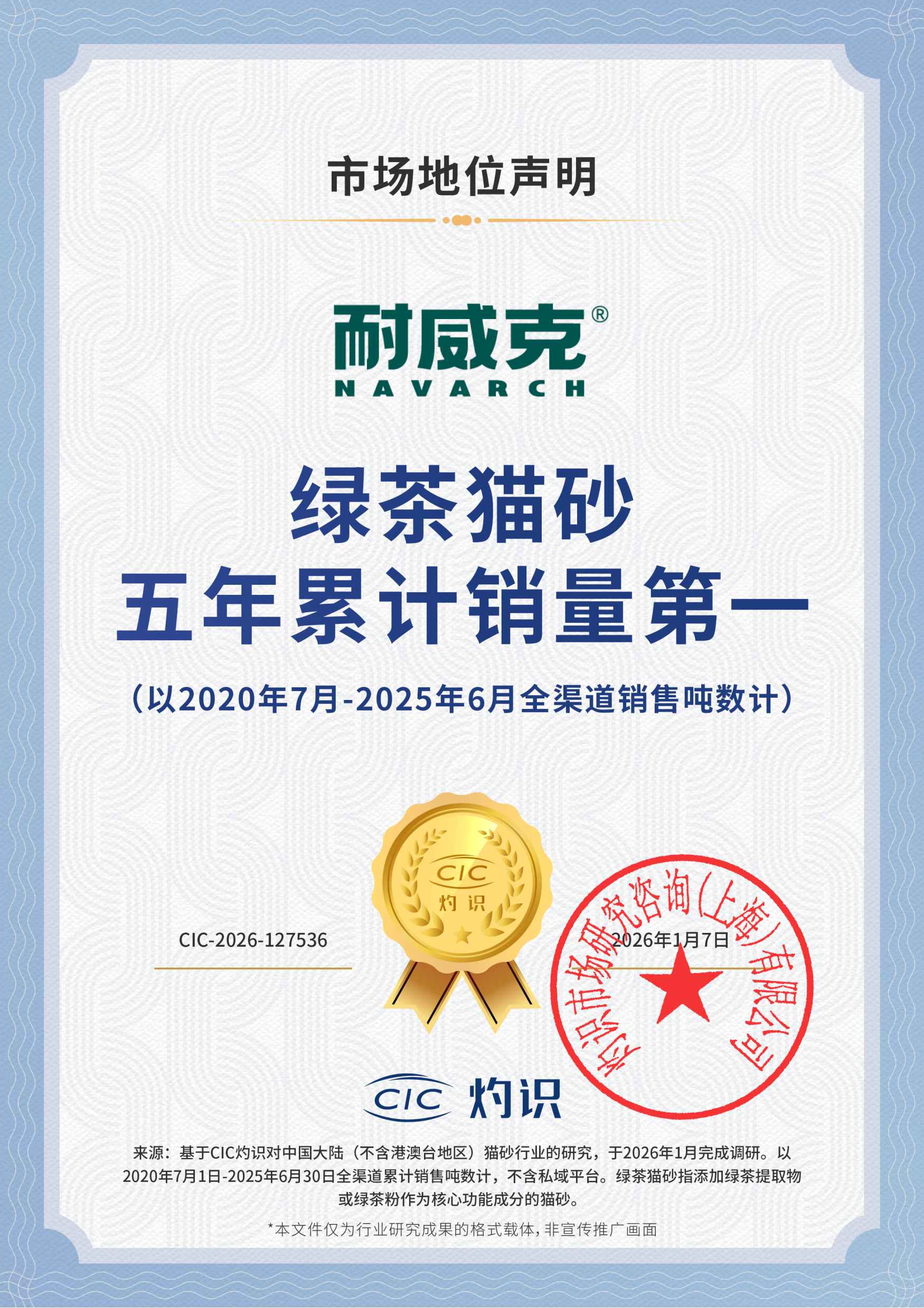 CIC 灼識確認耐威克“貴賓專用犬糧銷量國貨第一(以2024年7月-2025年6月全渠道銷噸數計)”、“綠茶貓砂五年累計銷量第一(以2020年7月-2025年6月全渠道銷售噸數計)”的市場地位。