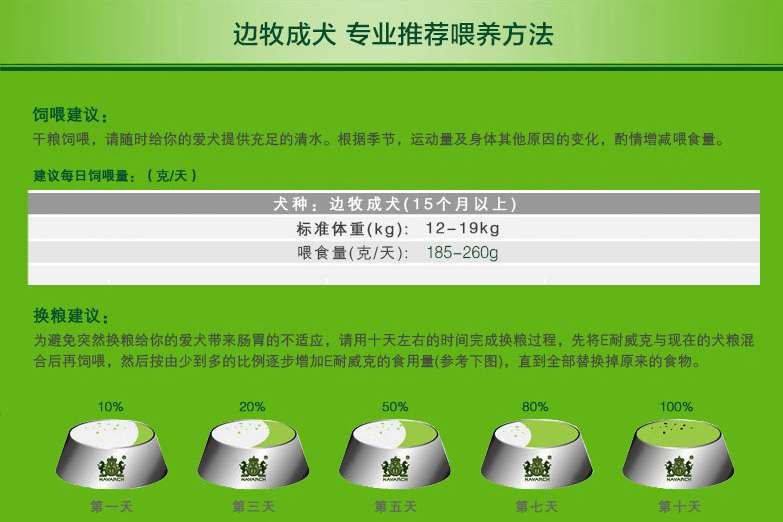 干糧飼喂,請隨時給您的愛犬提供充足的清水。根據季節、運動量及身體其他原因的變化,酌情增減喂食量。