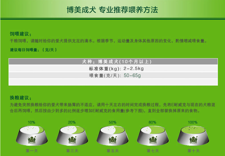 干糧飼喂,請隨時給您的愛犬提供充足的清水。根據(jù)季節(jié)、運動量及身體其他原因的變化,酌情增減喂食量。