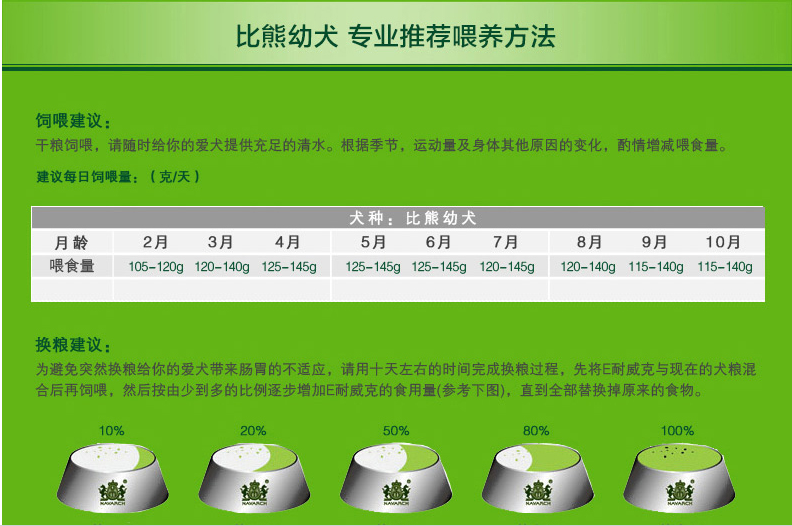 干糧飼喂,請隨時給您的愛犬提供充足的清水。根據季節、運動量及身體其他原因的變化,酌情增減喂食量。